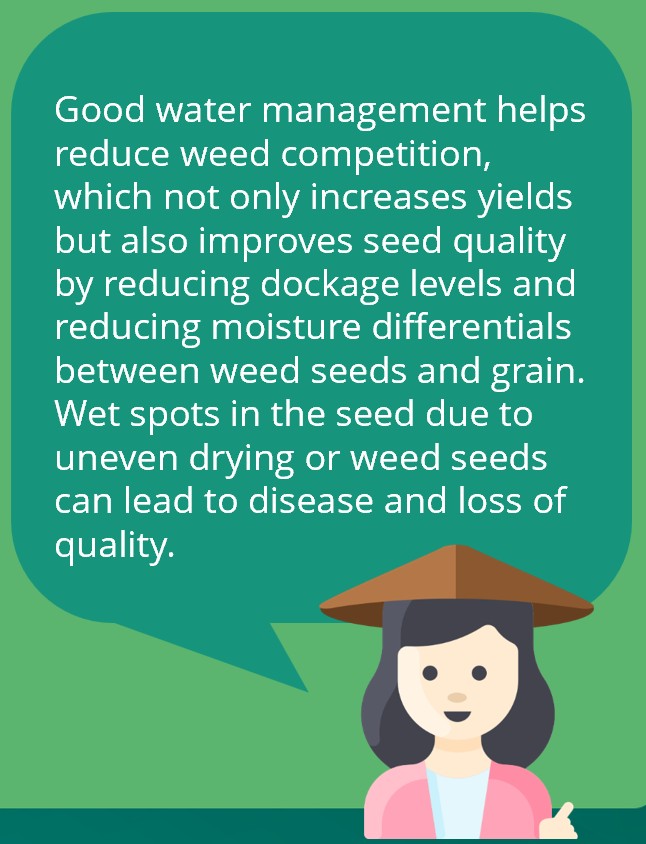 Uniform water depth across the field will contribute to more uniform crop, higher seed yields, and consistent MC in the grain sample. Reducing the variation in MC at harvest reduces the chance of seed damage from diseases.