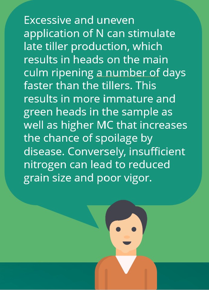 The application of the correct level and type of fertilizer for the variety and growing conditions is essential. The prudent application of N is essential to get an even maturing crop with full grain size.