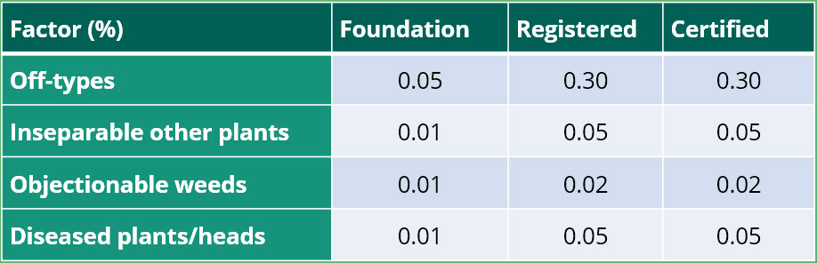 Each country has field standards for the allowable number of off-types, unacceptable weed types, and number of diseased plants. An example of field inspection standard is presented in Table 1.