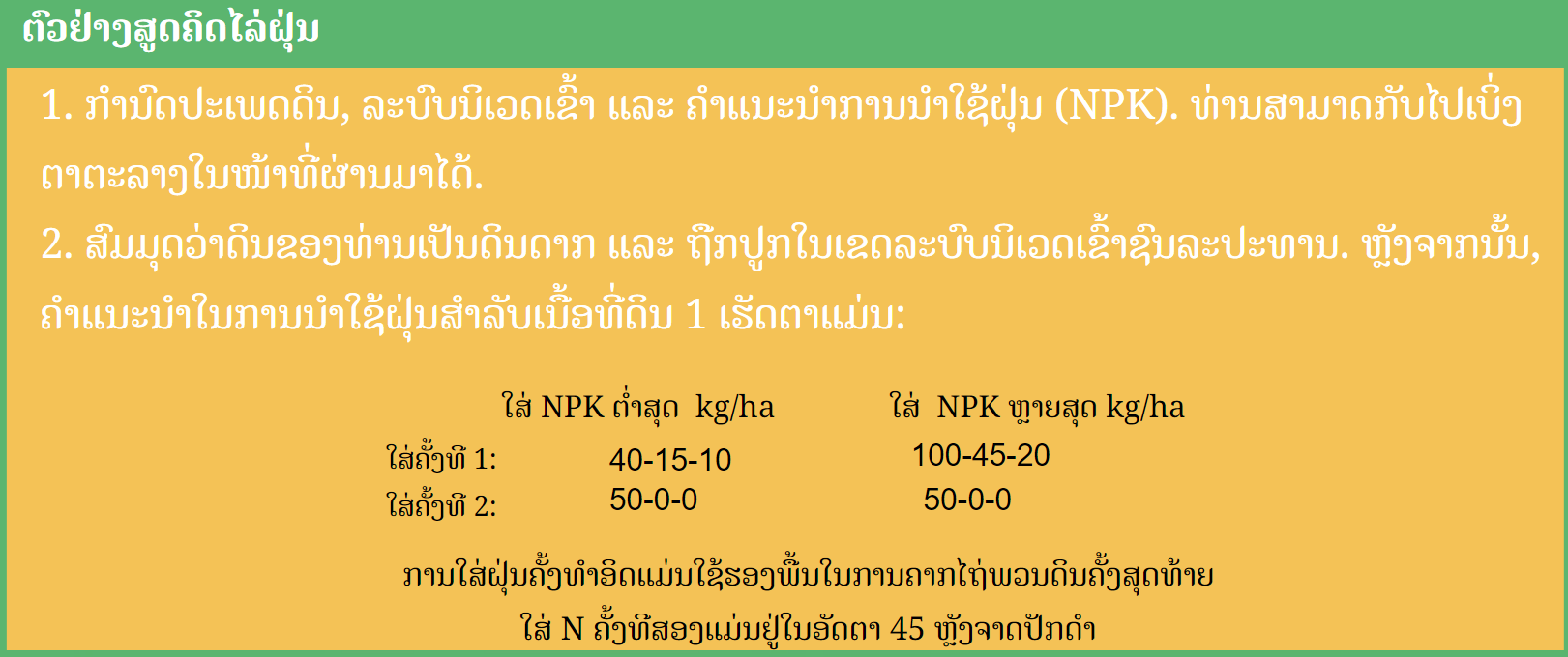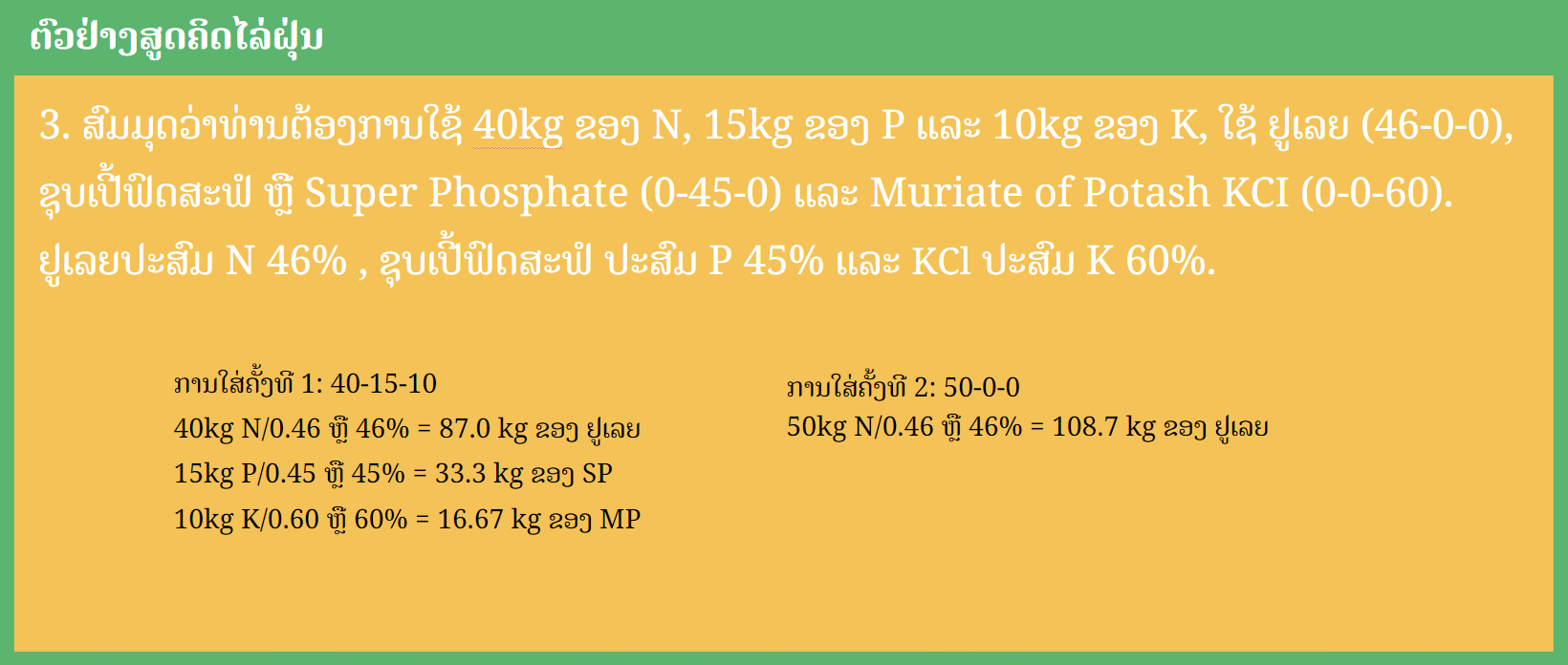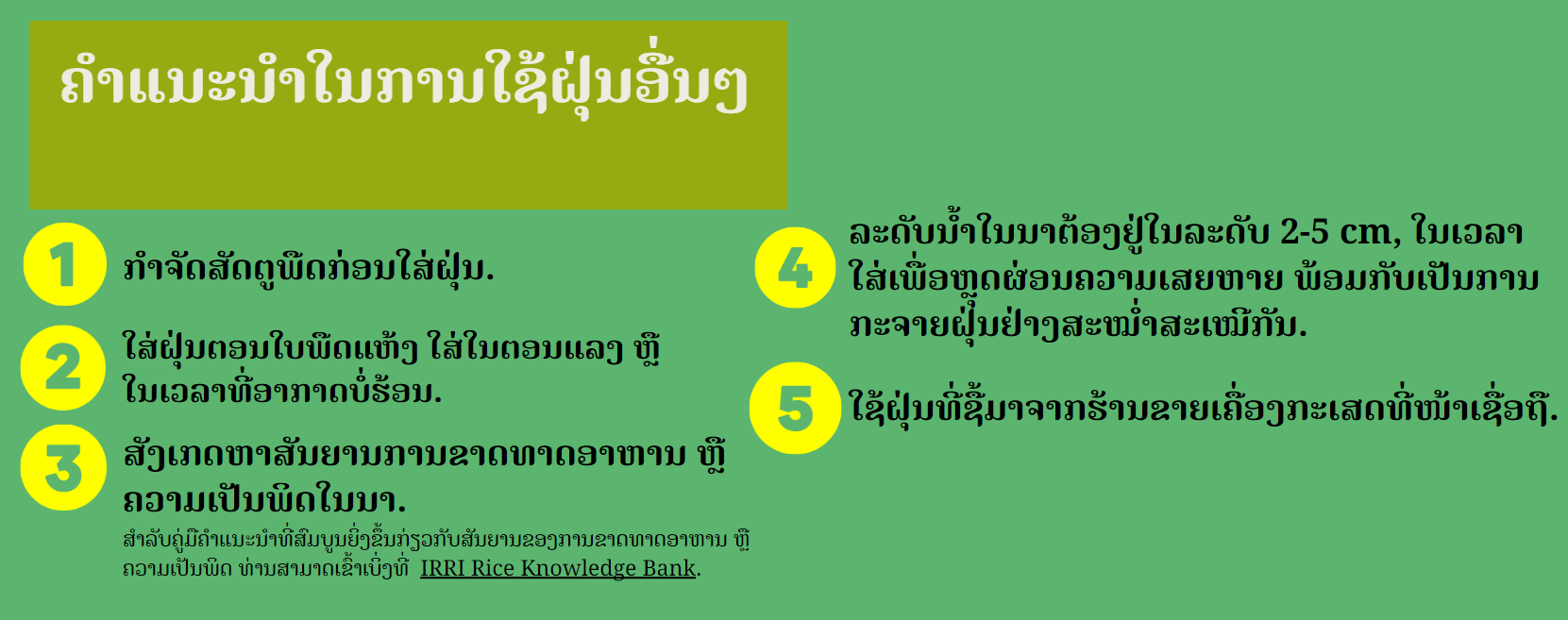 - ນຳໃຊ້ຝຸ່ນແຮ່ທາດຕາມທີ່ຕ້ອງການເພື່ອເອົາຊະນະຂໍ້ຈຳກັດຂອງທາດອາຫານຈຳເພາະ