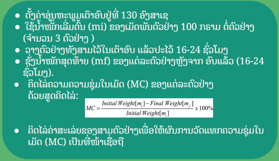 ວິທີການອົບແຫ້ງດ້ວຍເຕົາອົບ: ວິທີການອົບແຫ້ງ ແບບນີ້ຈະໃຊ້ເວລາດົນກວ່າ ແຕ່ຜົນທີ່ໜ້າເຊື່ອຸຖື ຄວາມ ຊຸ່ມໃນເມັດມີຄວາມສະໝໍ່າສະເໝີດີ. ມັນຈະຂື້ນຢູ່ກັບ ນໍ້າໜັກທີ່ຫລຸດລົງ. ຕົວຢ່າງເມັດພັນທັງໝົດຈະມີ ການຊັ່ງນໍ້ໜັກກ່ອນນໍາເຂົ້າເຕົາອົບ, ເມື້ອໝັ້ນໃຈວ່າ ຄວາມຊຸ່ມໃນເມັດຫລຸດລົງ (ແຫ້ງດີແລ້ງ) ແມ່ນຈະຊັ່ງ ນໍ່າໜັກຕົວຢ່າງເມັດພັນທັງໝົດຄືນອີກ. ການວັດ ແທກຄວາມຊຸ່ມໃນເມັດ ແມ່ນຄິດໄລ່ຈາກນໍ້າໜັກທີ່ສູນ ເສຍໄປ. ເນື່ອງຈາກການວັດແທກນ້ຳໜັກທີ່ມີຄວາມ ຖືກຕ້ອງແມ້ນຍຳສູງຈຶ່ງແມ່ນວິທີການທີ່ມີຄວາມຕ້ອງຖືກທີ່ສຸດ.