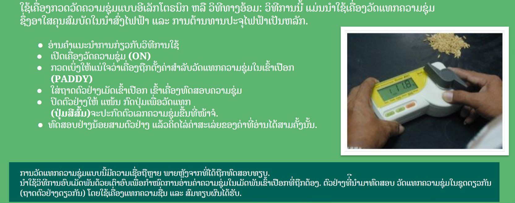 ການວັດແທກຄວາມຊຸ່ມໃນເມັດ ມີສອງວິທີ: ວິທີການແບບມາດຕະຖານ ຫຼື ເອີ້ນວ່າວິທີທາງກົງ: ຄືວິທີການອົບ ແຫ້ງດ້ວຍເຕົາອົບ ແລະ ວິທີທີສອງແມ່ນນຳໃຊ້ເຄື່ອງກວດຄວາມຊື່ນອີເລັກໂຕຣນິກ.