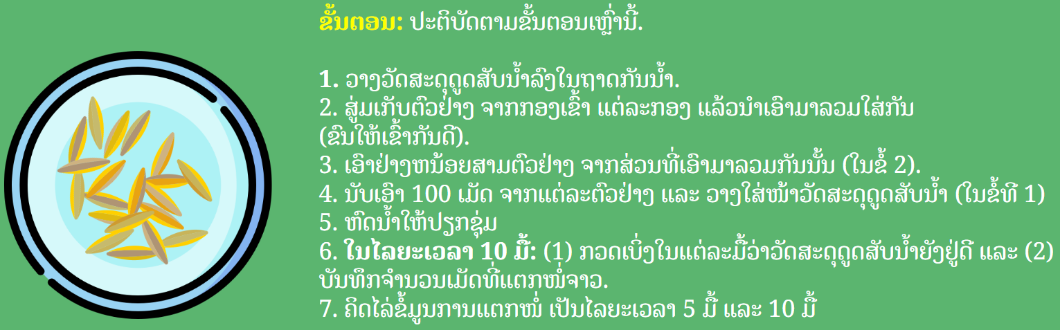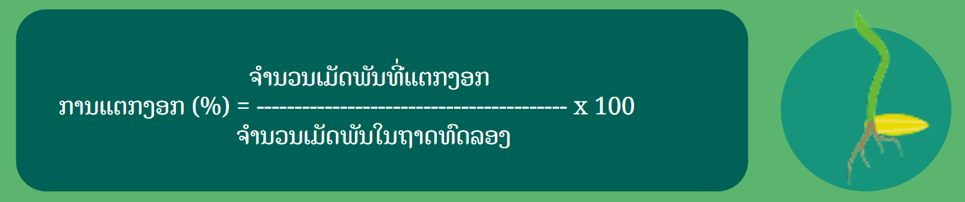 ການຄິດໄລ່ອັດຕາການແຕກງອກ: ອັດຕາການແຕກຈາວແມ່ນ ຈຳນວນຕົວເລກສະເລ່ຍຂອງເມັດທີ່ແຕກງອກໃນ ໄລຍະ 5 ມື້ ແລະ 10 ມື້.