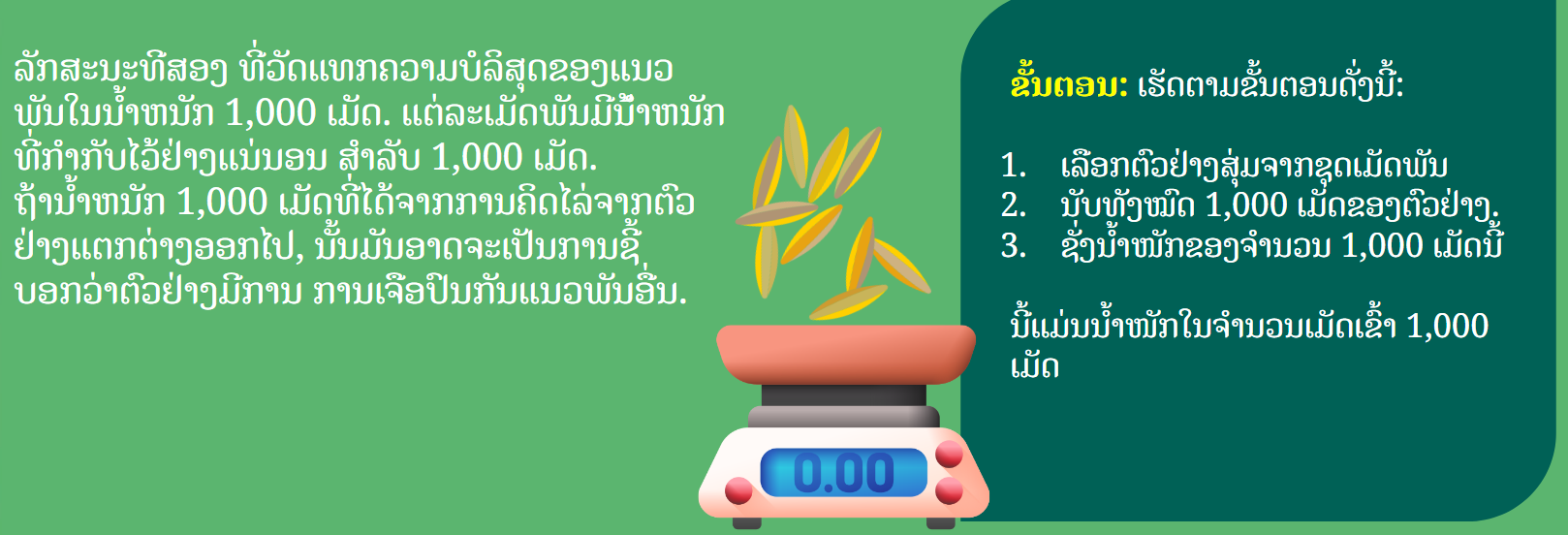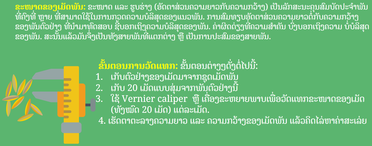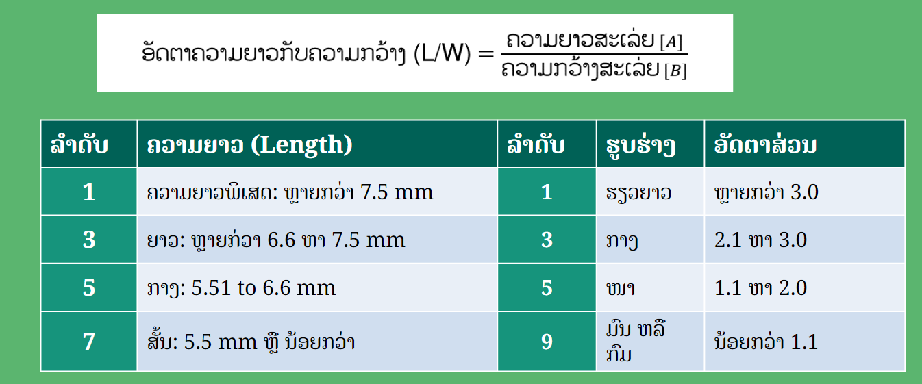 ຮູບຮ່າງເມັດພັນເຂົ້າ: ເພື່ອໃຫ້ໄດ້ຮູບຮ່າງເມັດພັນ, ອັດຕາສ່ວນຂອງຄວາມຍາວກັບຄວາມກວ້າງ ນຳໃຊ້ສູດຄິດໄລ່ດັ່ງນີ້ :