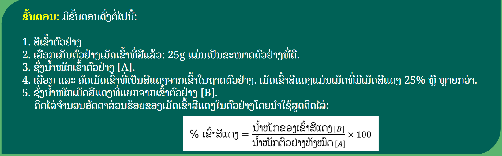 ເມັດເຂົ້າທີ່ມີເປືອກຫຸ້ມເມັດເປັນສີແດງຫຼາຍກວ່າ 25% ຂອງພື້ນທີ່ເປືອກຫຸ້ມ ຫຼື ແຕກແຫງເປັນເສັ້ນແດງໆ.