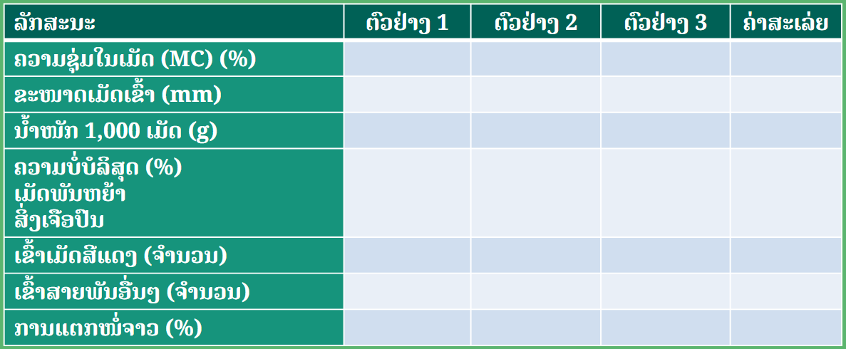 ເອົາຕົວຢ່າງຂອງເຂົ້າທີ່ໄດ້ມາດໍາເນີນການທົດສອບຄຸນະພາບທີ່ໄດ້ອະທິບາຍຂ້າງເທິງ. ນຳໃຊ້ຜົນການທົດສອບມາຕື່ມໃສ່ໃນຕາຕະລາງບັນທຶກຕົວຢ່າງໃນຂ້າງລຸ່ມນີ້: