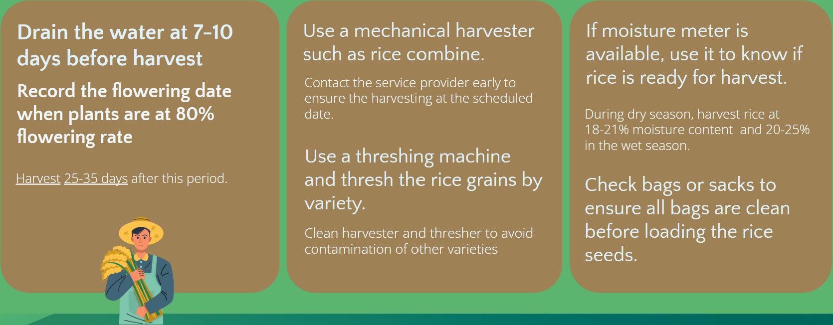 The source of seeds must be a foundation seed (for seed growers) or a certified seed (rice growers) from a Rice Research Center or a certified Seed Multiplication Center.